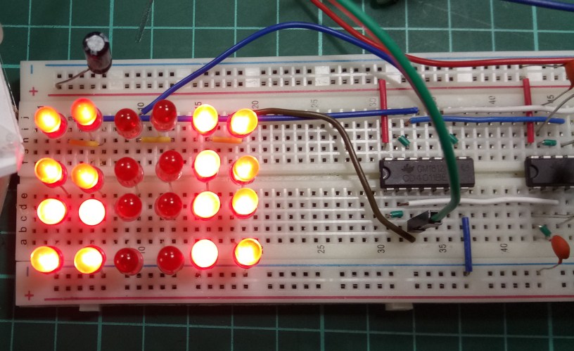 Devrede kullanılan ‘DEĞİL’ kapısı (aşağıda daha detaylı anlatılacaktır) girişindeki gerilimin tersini alır. Girişte gerilim varsa çıkışta yoktur, tam tersi girişte gerilim yoksa çıkışta vardır. Önlerindeki ve arkalarındaki sayılar entegre devrenin bacaklarıdır. Şimdi herhangi bir noktadan başlayarak be bacaklar üzerinden çalışmasına bakalım; 7 numaralı giriş eğer 0 volt ise 6 Vcc’ye eşittir. 6, 9 numöaraya bağlı olduğundan 10 numaralı bacak bunun tersi yani 0 volt olur. Bu durumda 10 numaralı bacağa bağlı olan 8 LED sönük kalacaktır. R2 üzerinden şarj olan C2 kondansatörü 5 numaralı bacaktaki gerilimi 6 numarayla aynı seviyeye getirdiği anda 5 numaralı bacak Vcc, 4 ve buna bağlı 11 numaralı bacak 0 volt olur. Bu durumda 12 de Vcc olacağından ortadaki sekizli LED grubu yanmaya başlayacaktır. 4 numaralı bacak , 3 numarayı da 0 volt yapacağından, 2 numaralı bacak Vcc seviyesinde olur. Bu bacak 14 numaralı bacağa bağlıdır ve 15 numaralı bacak da bunun ‘değil’i olacağından 0 voltta kalır. En soldaki sekiz LED sönüktür. 2 numaralı bacak Vcc seviyesinde olduğundan C3 kondansatörü R3 direnci üzerinden şarj olacak ve zamanla 7 numaralı bacağı Vcc’ye çekecektir. Bu durumda 6 ve 9 numaralı bacaklar 0 volt civarında olup, 10 numara Vcc seviyesinde olacak ve en sağdaki LED grubu yanmaya başlayacaktır. Bu döngü böylece devam eder. LED’lerin yanıp sönme hızını belirleyen R ve C değerleridir. Bu devre bu kadar.