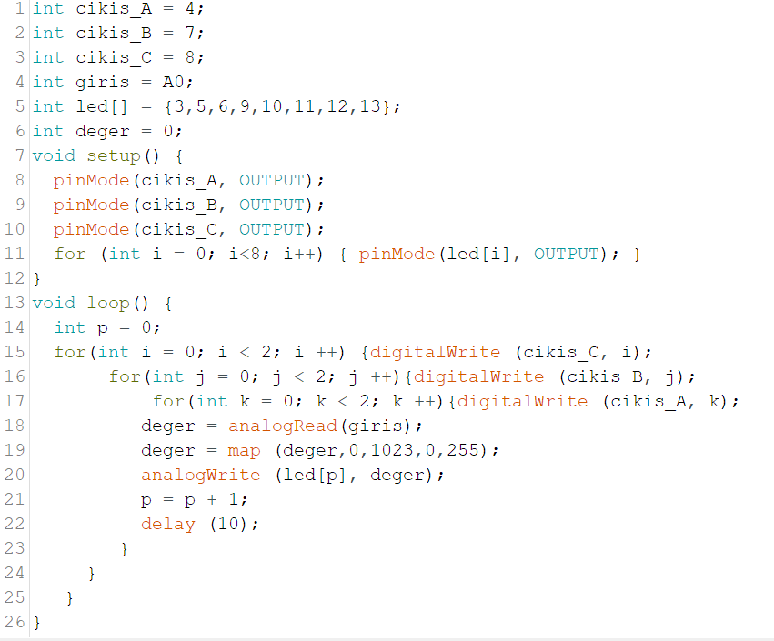 Yukarıda önce bacak bağlantıları ve bunların giriş/çıkış oldukları tanımlandı. Loop’da; ‘p’ hangi LED olduğunu gösteren değişken. İç içe ‘for döngüsü’ ile CBA çıkışları : 000’da 111’e kadar saydırıldı ve tüm girişler okutuldu. Her bir okuma esnasında elde edilen ‘deger’ değişkeni ‘map’ komutu ile 10 bit girişten 8 bit çıkışa dönüştürüldü. Elde edilen bu değer LED’ler üzerinden ‘analogWrite’ komutu ile yazdırıldı.