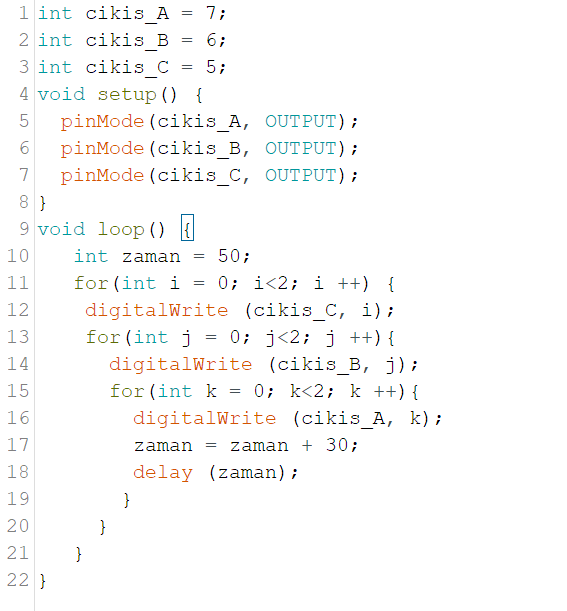 Bu koddaki hızı belirlemek için ‘zaman’ değişkeni oluşturuldu. Hatta artistik olması açısından ‘delay’ komutundaki bu zaman değiştirilerek LED’lerin yanma hızında bir yavaşlama etkisi de oluşturuldu.