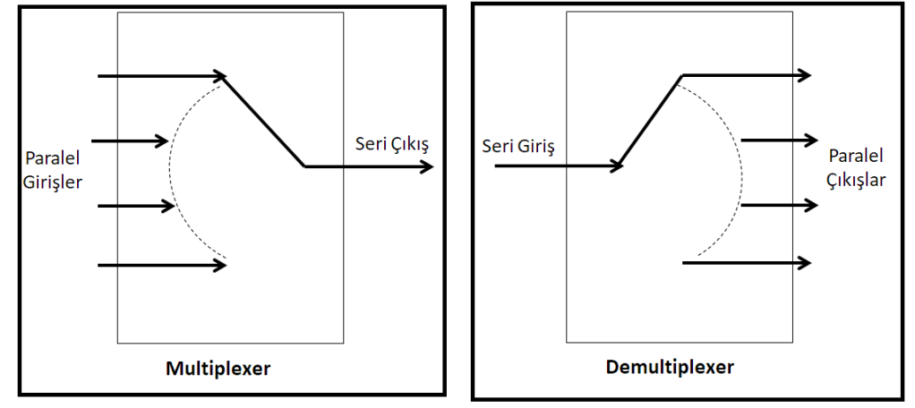 Multiplexer/Demultiplexer çoklu rotary switch (komutatör anahtar) olarak kullanılabiliyor. Multiplexer (Mux) paralel girişleri seri çıkışa yönlendiriyor ve bu yüzden ‘Veri Seçici’ olarak adlandırılırken, demultiplexer (Demux) ise seri giriş, pararlel çıkış olarak kullanılıyor ve ‘Veri Dağıtıcı’ olarak adlandırılıyor.