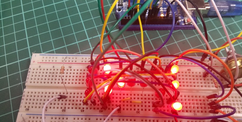 Bu kadar kod yeterli oldu. Bu arada akış hızını belirlemek için ‘time’ isimli bir değişken atandı. Bu değişkenin değeri de bir potansiyometre(10k) ile ayarlanabiliyor. Potansiyometre A0 bacağına bağlandı(diğer uçları da GND ve 5V pinlerine bağlandı). Manuel yaptığım denemelerde time değeri 50-500 (ms) arasında iken güzel görüntü elde ettiğim için, potansiyometre bu sınırlar arasında çalışıyor.
