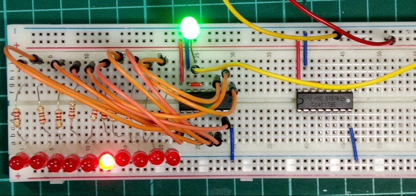 Frekans bölücü olarak CD4017 kullandım. Bu entegre aslında onlu sayıcı (decade counter). Data sheet‘e göre; CMOS olan bu entegre 3-18 volt besleme ile çalışabiliyor. Maksimum giriş frekansı uygulanan besleme gerilimi ile orantılı ve 5.5 MHz’e kadar çıkıyor (5 volt beslemede bile 2.5 MHZ e kadar çıkabiliyor ki benim kullandığım osiloskop için bu sınır sadece 200 kHz). Toplam 14 bacaklı entegrenin saat (clock) girişinden kare dalga yollandığında sırasıyla 0-9 çıkışları 1 oluyor. Zaten bu bacaklara birer tane LED bağlandığında LED’ler sırayla yandığında bir akan ışık efekti alınıyor. Zaten YouTube’da birçok örneğini görebilirsiniz.