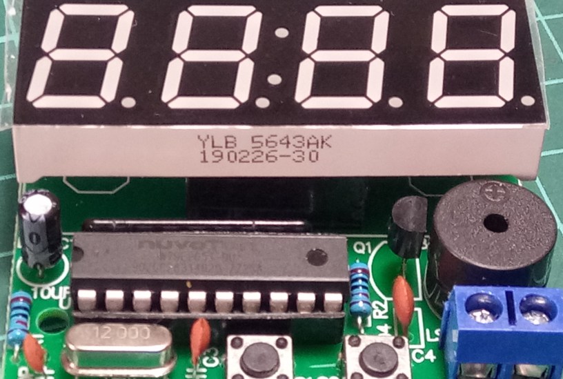 Devre plaketi 42×52 mm boyutlarında.Pek fazla eleman yok ve yapımı da kolay. Devrede 4-bit 0.56 inç 7-parçalı display kullanılmış. Ama toplam 12 bacakla kontrolü kolay. Her bit için (A,B, C, D, E, F, G)7 bağlantı, 4 bit için 4 ortak katot ve ortadaki yanıp sönen üst üste iki nokta için de bir bağlantı.