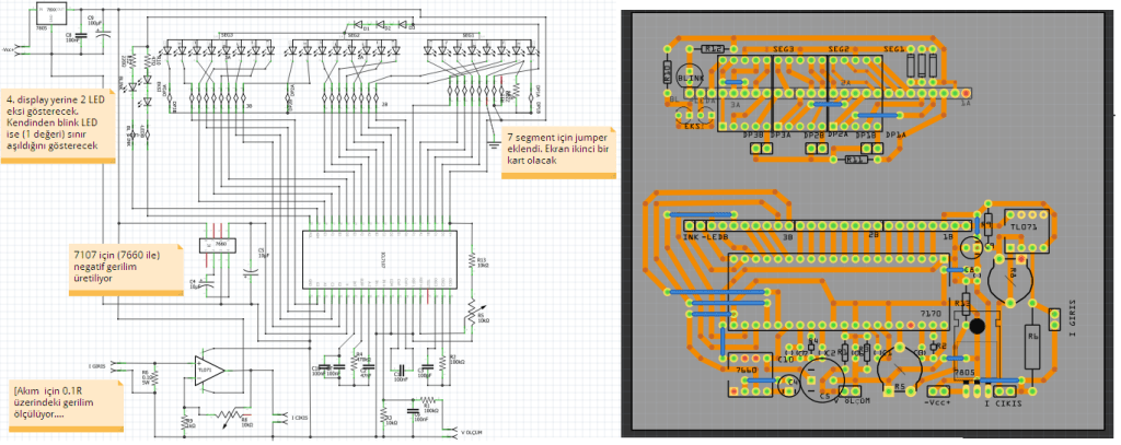Bu devreyi önce board üzerinde gerilimölçer olarak test ettikten sonra devre için baskılı devre tasarımına geçildi. bu devre giriş gerilimini bir şekilde display üzerinde gösterebildiğinden aslında sensörden gelen (linear) değerleri gösterecek şekilde tasarlanabilir. Örneğin sıcaklık ölçümü gibi (ki bunu yapanlar da var). Ben bu devreyi akımölçer olarak düşündüm. Sadece bu entegre fiyatına alınabilecek küçük hazır voltmetreler yerine bu devreyi seçmek için nedenim vardı; birincisi kendim yapmak tabi ki. İkinci nedense hazır voltmetreler 1 volt üzerinde gerilim ölçmeye başlıyorlar. ben ise çok küçük değerler ölçmeye çalışıyorum.