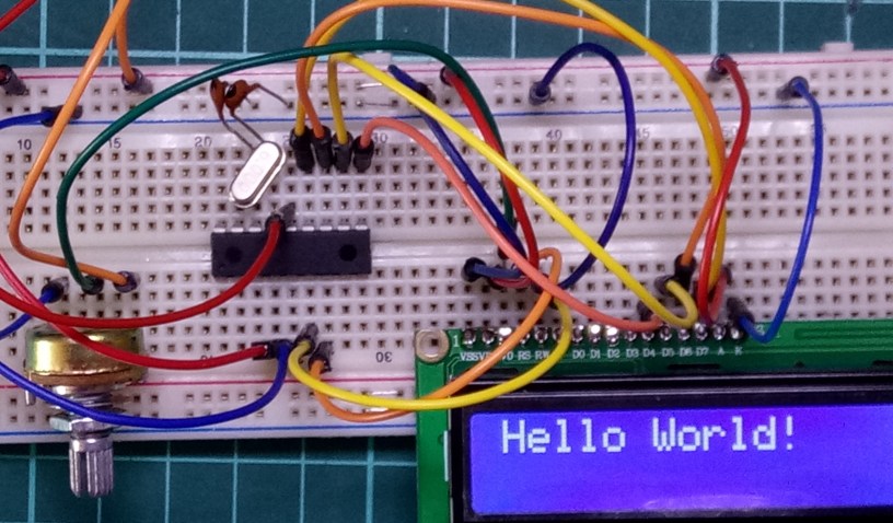 Devremizin şeması da oldukça sade. Sadece 15-16. bacaklar arasına 20MHz bir kristal ile birlikte, her iki bacağı da 15-30pF arası bir kondansatör ile gnd hattına bağlıyoruz. Potansiyometre ekran kontrastı için.Diğer bağlantılar 628A ile LCD ekran arasında ve aşağıdaki gibi: