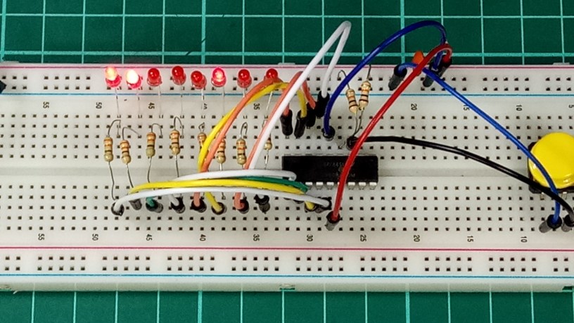 6’dan 13’e kadar olan (B0-B7) çıkışları birer koruma direnci ile LED’lere bağladık. 3 numaralı girişi bir buton ile GND ye bağlayıp, 10K’lık bir direnci pull up direnci olarak +5 volta çektik. 4 numaralı MCLR reset sinyalini de aynı şekilde 10 K’lık pull up direnci ile +5 volta bağladık. +5V ile GND arasına da 100 nF bir kapasitör bağlandı. Gerisini 16F628 kendisi yaptı.