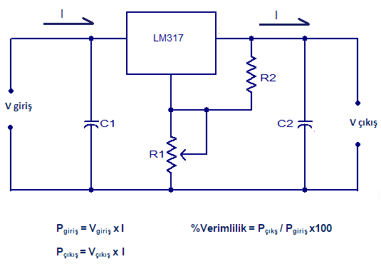 Lineer olan dönüştürücülere örnek olarak pozitif çıkışlar için 78xx (7805,07812,..) serisi, negatif çıkışlar için de 79xx serisi kullanılır. Bir de 78xx serisinin ayarlı hali var LM317 gibi. Bu dönüştürücülerde giriş akımı ile çıkış akımı eşittir. Bu sebeple giriş ve çıkış gerilim farkı, aynı zamanda giriş çıkış güç farkına (P = I.V) sebep olur. Bu güç kaybı da devrede ısı olarak ortaya çıkar ki bu da istenen bir durum değildir. Kayıptır. Bu kayıp da bu tür dönüştürücülerin verimliliklerinin düşük olmasına neden olur. Örneğin aşağıdaki devrede giriş 12 volt iken çıkış 3 volta ayarlanırsa devrenin verimi en iyi ihtimalle (kayıpları da düşünürsek) %25 olur. Ve enerjimizin %75’ini ısıyla kaybetmiş oluruz.